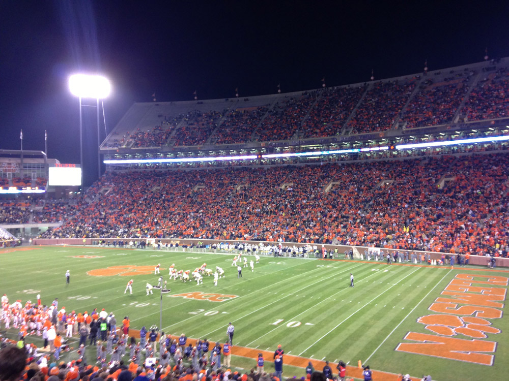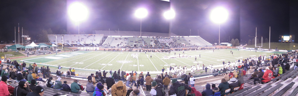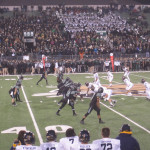 I pick up a $35 face value ticket for 20 bucks from an old lady pawning a single after her nephew elected to stay home on a brisk night. As the game kicks off, the Rockets take the field garbed in garish pink and blue uniforms – an admirable salute to breast cancer awareness, but a trend that I find thoroughly tired at this point. But they play spirited football for the first half, holding the explosive Northern Illinois onslaught to a single touchdown and carry a 10-7 lead into the locker rooms at halftime.