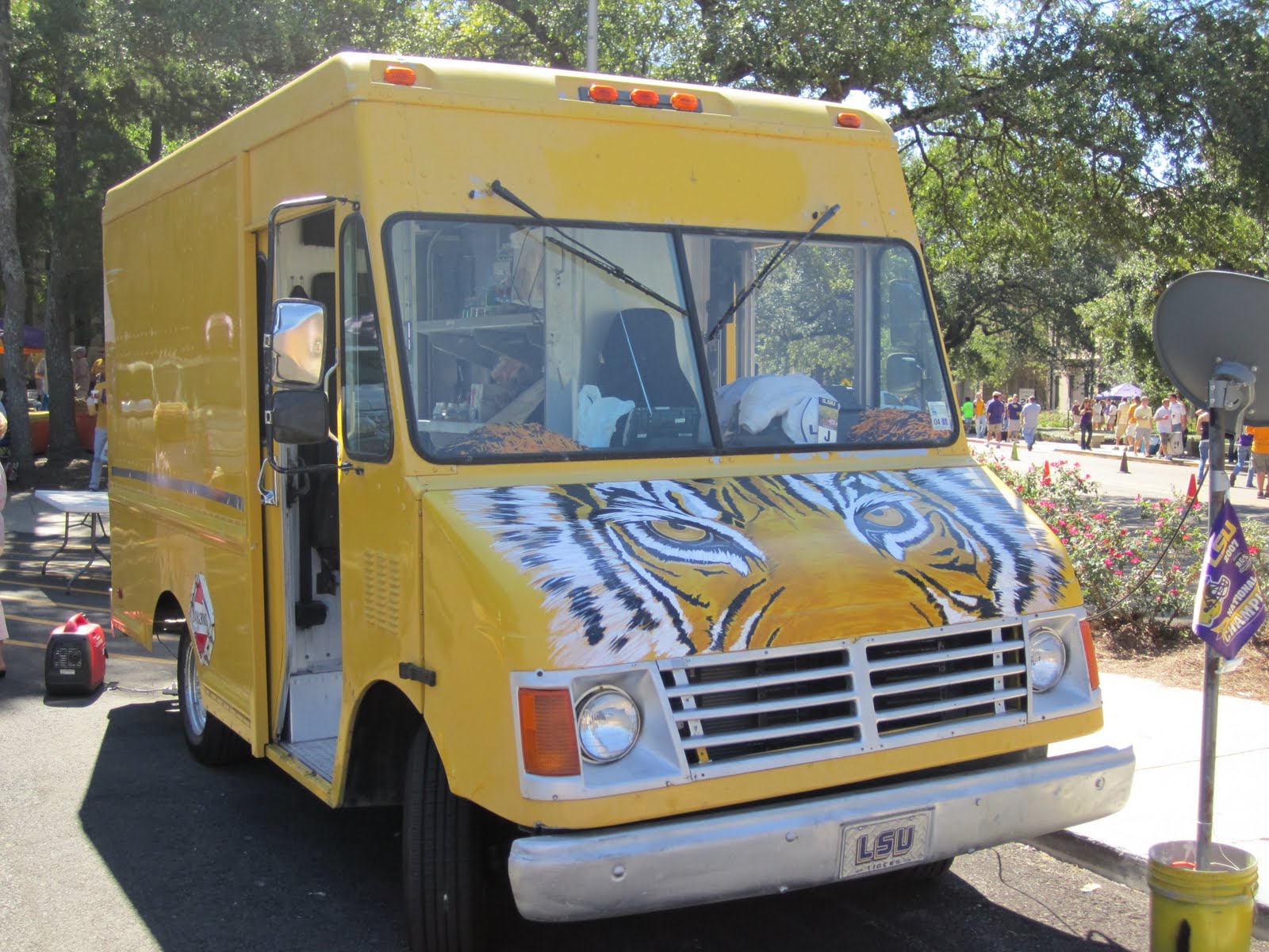 Following the player procession, we meet up with Mandy’s aunt Karen, host of the infamous Van Geaux tailgating rig. If there is such a thing as professional tailgating, Karen would rank among the best, and she welcomes us with the same gracious hospitality I enjoyed back in 2010. Their converted DHL truck overflows with provisions, and I make several raids on an overflowing tray of incredible home made tamales. Soon, the weather grows angry, and ask the sky turns fowl and we’re forced to find shelter and take refuge under a bus shelter as an afternoon of blissful LSU tailgating is ruined.