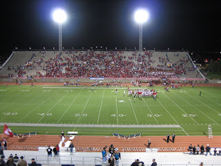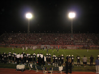 The stadium itself lives up to its reputation.Every seat in the 20,000 capacity house was sold out, and we were glad to have purchased tickets in advance over the phone a week earlier.Between the opposing sides of black and red fans, two full bands, cheerleaders, bell ringing, spirit squads, press box, and jumbotron (with instant replay) the environment more closely resembled a collegiate atmosphere than any high school game I had ever been to.This was certainly a far cry from the meager hundreds of fans that my high school drew on the best of days.Still, the passion and emotion that high school players live and breathe with their teams was gratifyingly evident